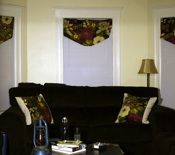 What was once an ugly, boring, college pad is now decorated and homey. Some super simple curtains, hemmed and tied to the blinds make the windows stand out. Pillows add some fun colors to the boring brown couch. Neat decorative touches like the cool train lamp and some good coffee table books and we are well on our way to living like grown-ups instead of college students. Now if I could just convince the boys not to leave cables and computers all over the place, we’d be set!