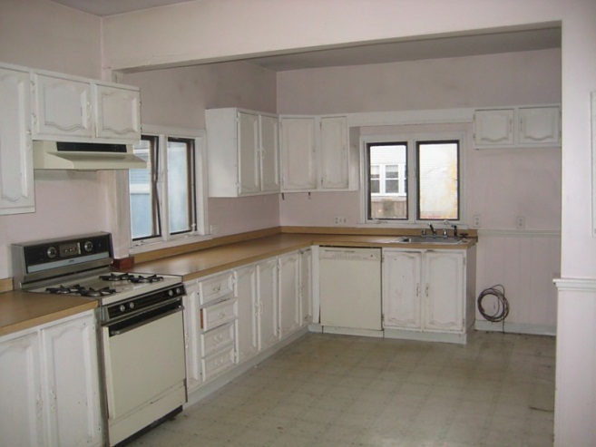I’m thinking that something with a similar design, but in white, might be just the thing to cover the damaged drywall. Is it going to be too much? I can do 3/4 or chair-rail height. As a refresher, here is the kitchen before: