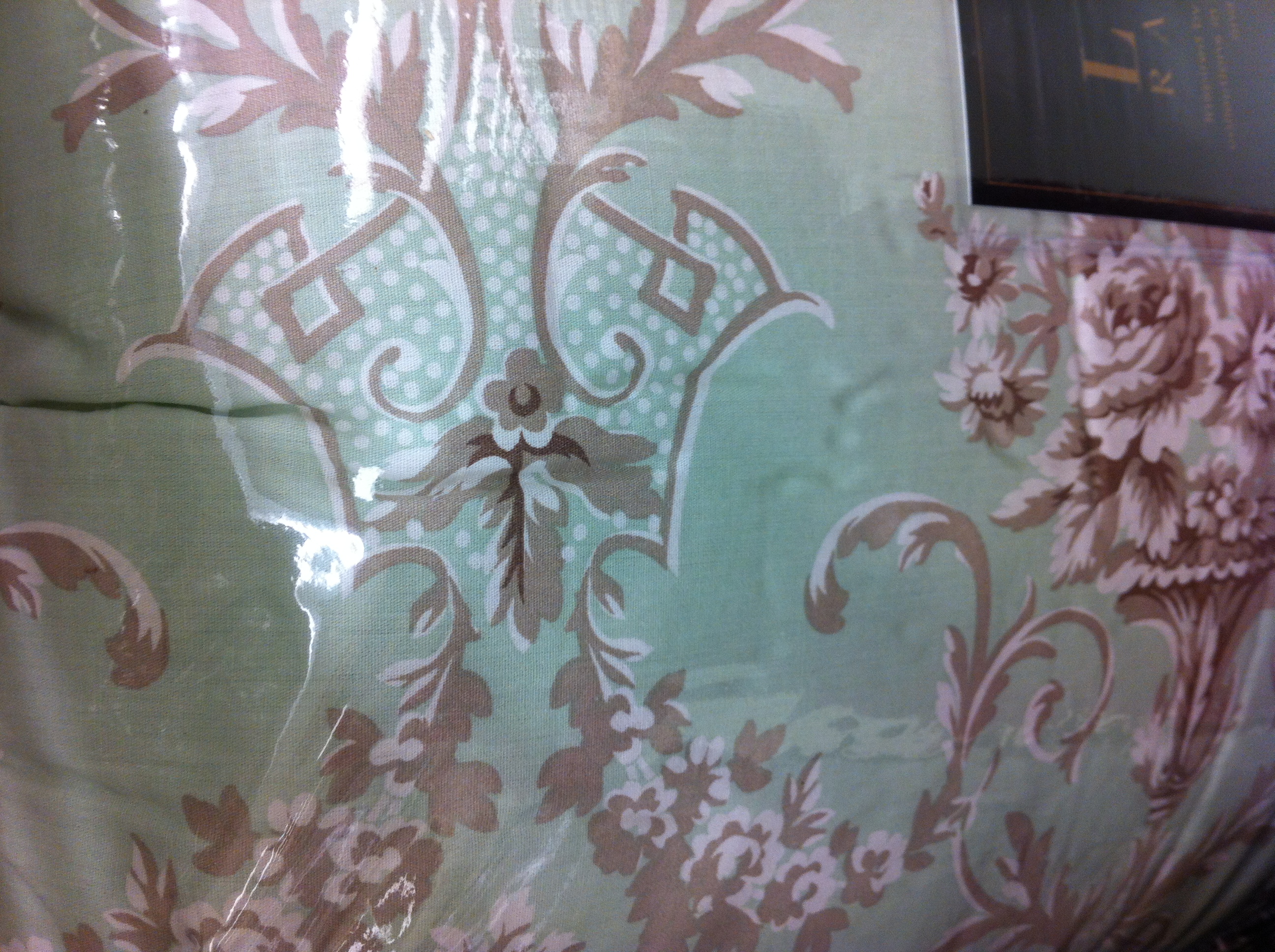 The bedspread has a great green and taupe floral/damask pattern to it.