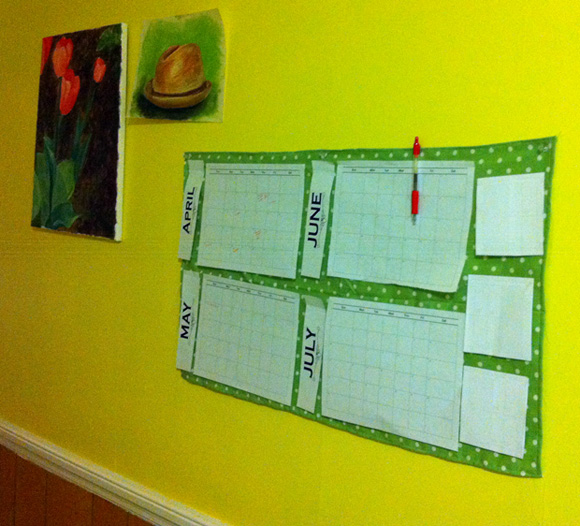 I just printed out calendar pages and Month names and machine stitched them onto a piece of cute fabric. Easy to update and recyclable once I’m done. I even stiched a couple of notepads of scratch paper for things like groceries and to-dos. You could get fancy and make cute labels for those but I’m going to let mine take on purposes of their own.