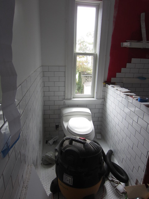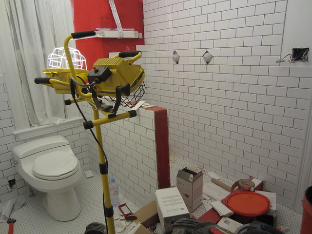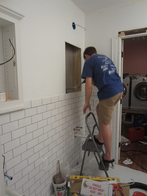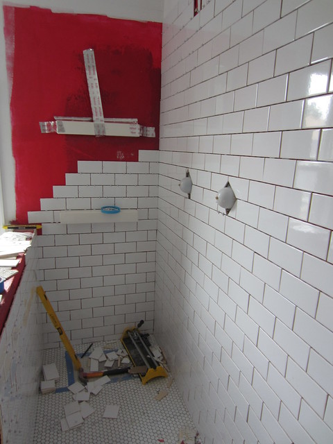 It’s been slow but steady progress on the master bathroom. The emergency gas engineer came last week and checked for the hot water supply only to find and fix the broken line. The only thing taking time is the tiling of the bathroom. There is SO MUCH tile in that room. I’m to the point where I never want to see another subway tile in my life!