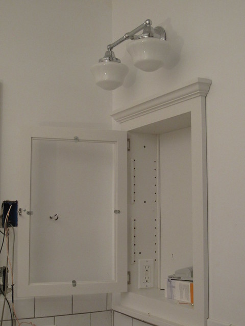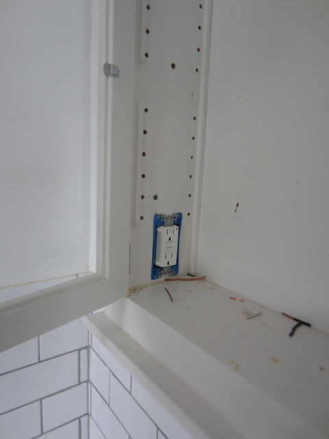 Stefan also installed the medicine cabinets! We had the position all figured out but he still had to cut the holes in the drywall and cut the holes in the studs and the boxes themselves so that I could have these handy tooth-brush charging outlets in my medicine cabinets!