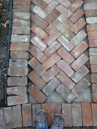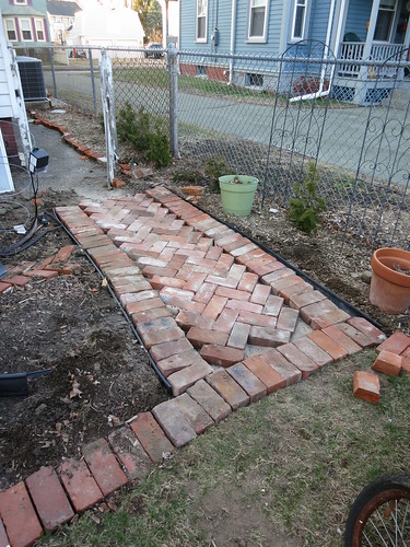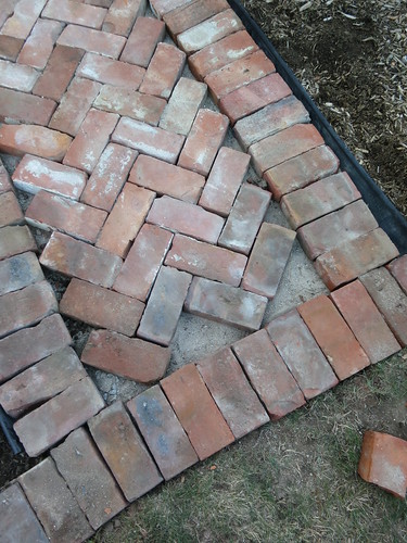 I edged the path with a row of bricks and filled in the center with the herringbone pattern.