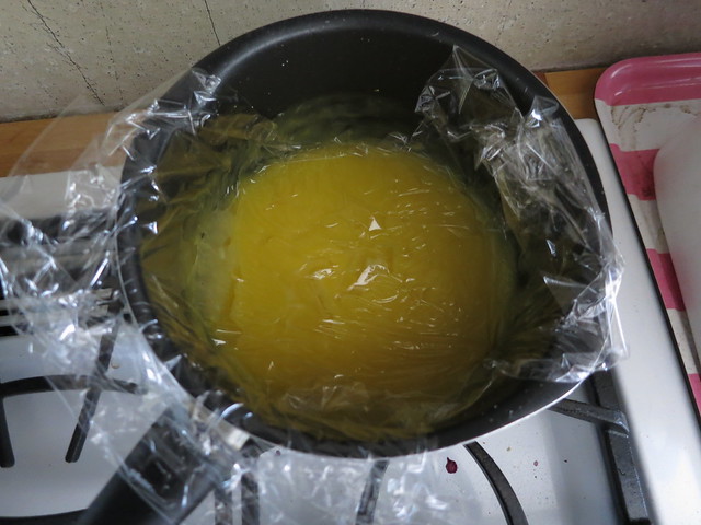Then we take them off the stove and lay plastic over the top so the custard doesn’t form a film.