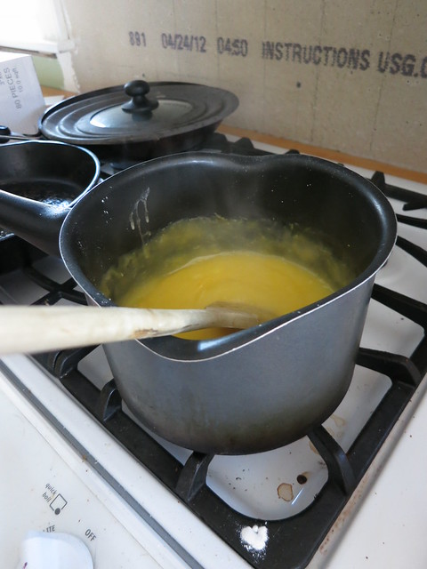So 6 egg yolks, some water, some sugar, some corn starch, lemon zest and lemon juice get cooked on the stove.