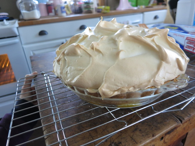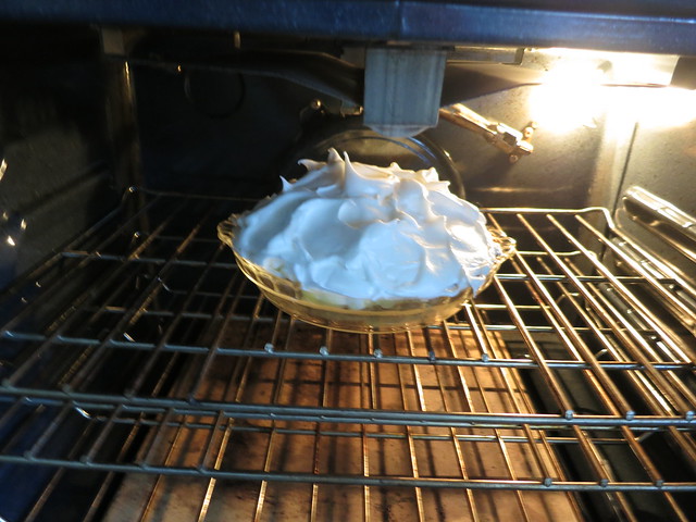Toss the custard back on the stove when you are at soft peak and leave the mixer going up to stiff peak while you re-heat the custard. When the meringue is done, quickly put the custard in the piecrust and top with the meringue. Use the back of a spoon to make the pretty swoops and toss it in the oven.