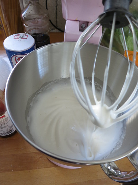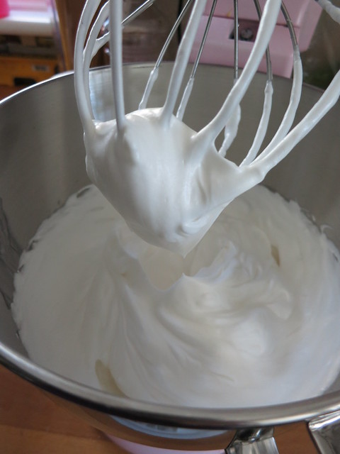 Now we make our meringue. Whip up the egg whites, sugar, and cornstarch to a stiff peak.