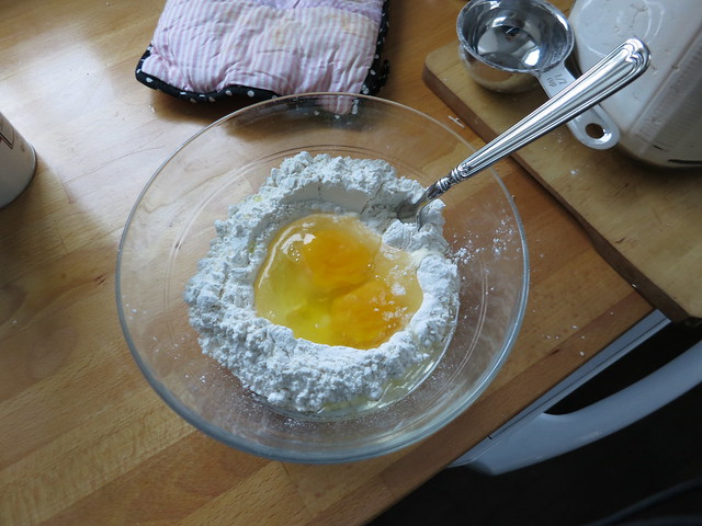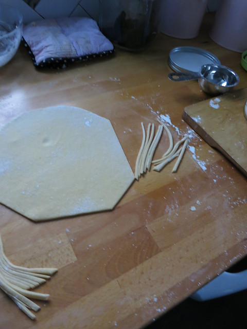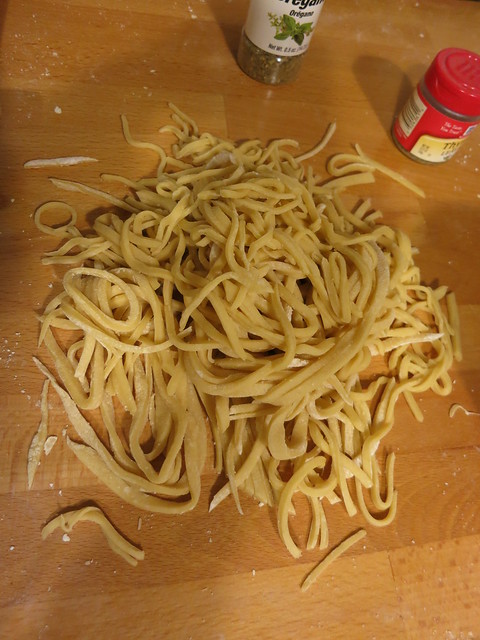 Stefan and I went to a friend’s house recently for a pasta dinner, make your own pasta. It was super fun. We had a pasta press but had to cut the noodles by hand. I decided to try it again and I found some simple instructions over at thepioneerwoman.com. I have to say this would be a great cooking project with kids. Kids love pasta and this is a fun and easy project that cooks up fast.
