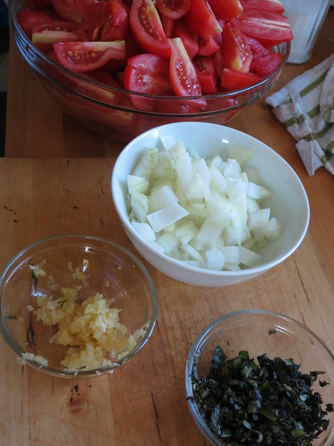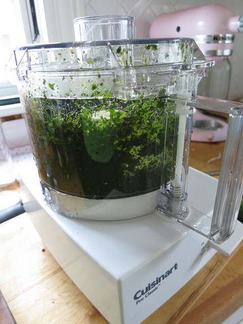 I process the basil leaves with plenty of olive oil. I spoon out most of the basil slurry into ice cube trays for freezing at this point.