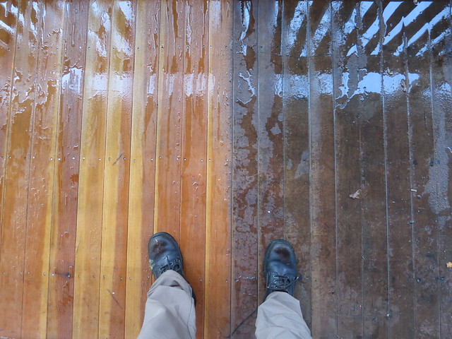 For now, since the water still seems to be beading, I think we are going to toss a layer of the water Seal on the steps for the winter and leave the porch floor as-is. In the spring we want to get a new deck installation and we are going to use a decking cleaner/sealer system on the floor.