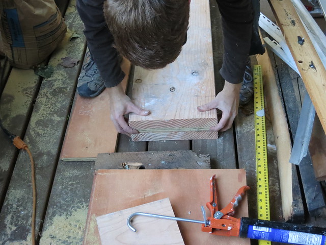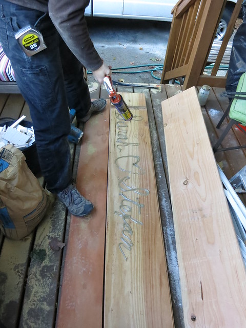 For the header of the new door, we used a sandwich of 2x12s and plywood. Stefan wrote our names in construction adhesive. My kind of romance!
