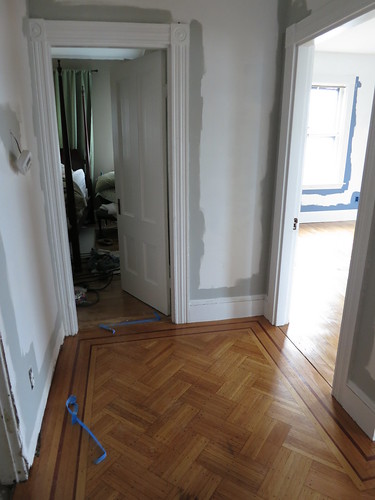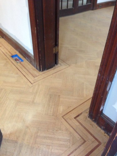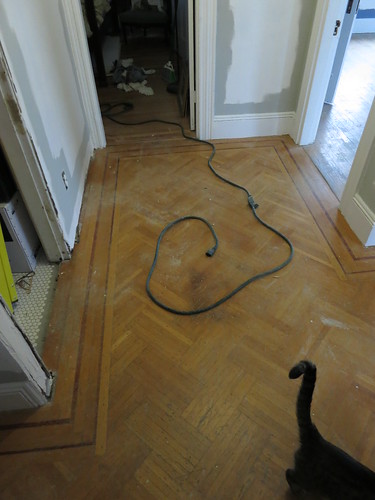 This was the view into the hallway leading to the entry ahead and the dining room on the left. They started with the big sander and then went around with an edger to finish things off.