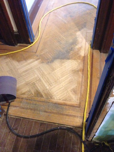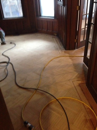 I was only able to snap a few pictures so-as not to get in the way of the sanders. This is the entryway from the front door. It is all sanded and being vacuumed when this picture was taken.