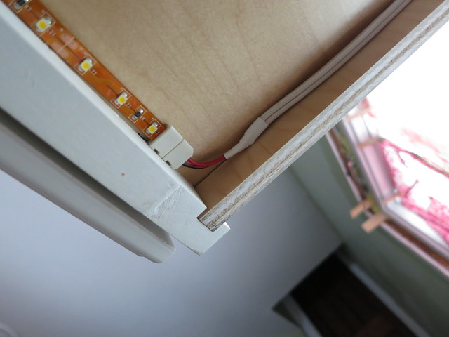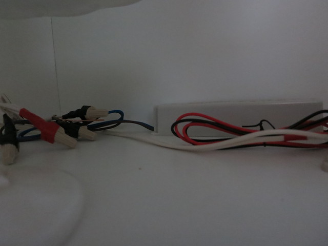 The tape has an adhesive back to it was just a matter of cutting the ribbon at the appropriate spot, using these handy clips to attach to it, and connecting the wire from these clips to some lamp cord we strung to all the sections of cabinets. We soldered and heat-shrink wrapped the cord connection but Stefan and I are huge nerds and there are plenty of simpler ways to get everything wired together.