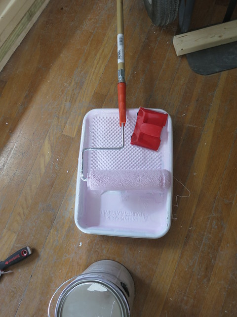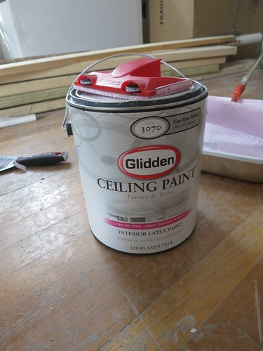 The Glidden ceiling paint is super thick and sticky. It sticks to the roller and you can roll forever on one roller’s worth of paint – especially compared to the Zinsser primer I had been working with.