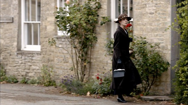 Mrs. Hughes sneaks food to the former maid Ethel and her illigitimate boy and has an adorable scarf on under her coat. I love the way she is wearing the scarf with just a bit of the pattern showing. Mrs. Hughes has more fashion sense than she lets herself believe. I’m always finding something of hers that is downright lovely.