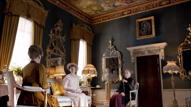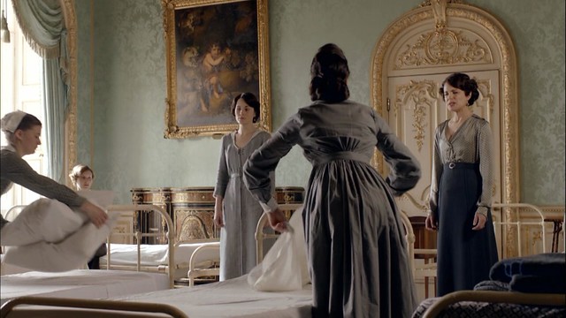 They’re setting up beds in the parlour. I love Lady Grantham’s outfit and the room with the large-scale paintings is beautiful.