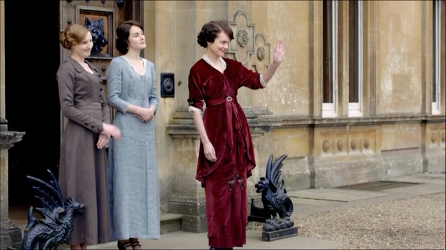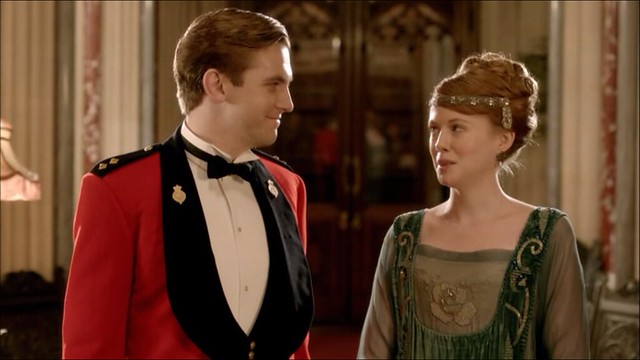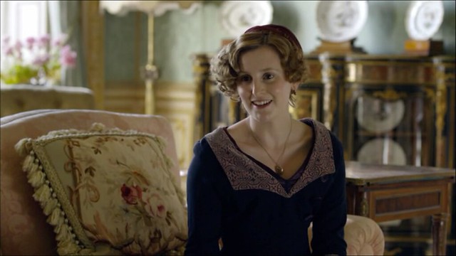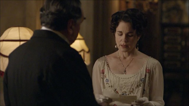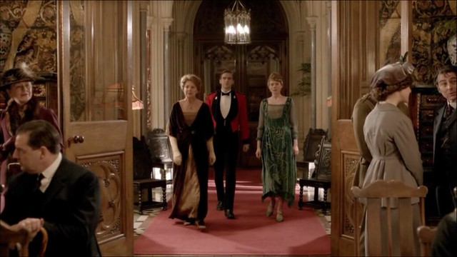 We meet Lavinia at a benifit concert. Mrs. Crawley, Captain Crawley, and Lavinia enter the room. I love Mrs. Crawley’s jacket. That would be so easy to make and would be a great addition to a wedding or prom dress.