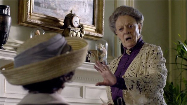 Here is the Dowager Countess being told that the rumors about Mary are true. She looks shocked and appalled but she has a super cool mantle clock and a gorgeous Cameo at her throat. I love me a good Cameo.
