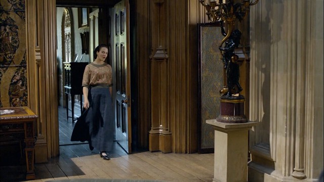 Lady Sybil looks beautiful as usual. I love the skirt and blouse. I could wear either of them today. The little black low-heeled shoes are also super cute. I need a pair like that. As always the house is stunning. This is the entry way. Wood paneling, cool lamp sculpture, neat wallpaper/tapestry.
