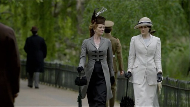 Mary spends some extra time in London with Lady Rosamund, Lord Grantham’s sister. She has a great hat but I love this military riding coat look. I can see it being paired with something flowing and sparkly peaking out underneath. Lady Mary’s all white suit is good in concept but it doesn’t quite fit her right or something but I do love the umbrellas.