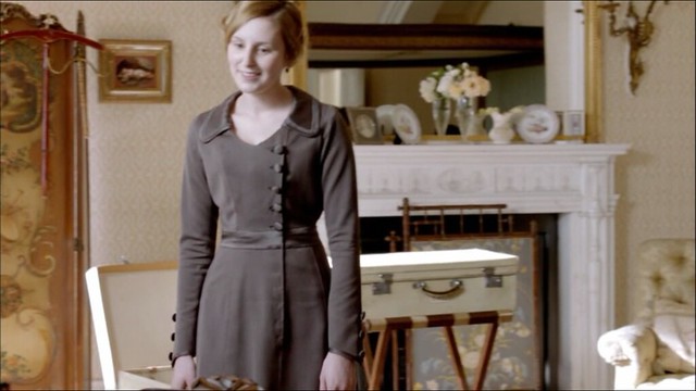 Sybil is packing to go to nursing school and flurrying about in this cute almost nautical skirt and blouse. Both pieces are quite wear-able and I wouldn’t be surprised if the sailor collar back comes back in style.