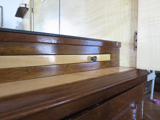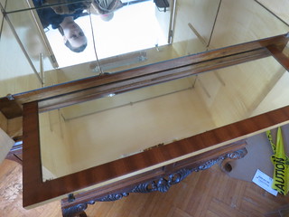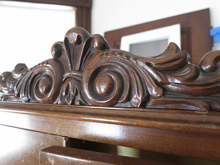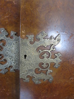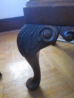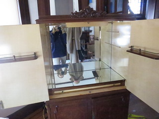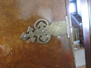 Isn’t she pretty. Guess what I paid…guess. $100. and he threw in a bunch of neat old books with it. It’s burled walnut veneer on the outside with some maple veneer on the inside. There’s a broken mirror but nothing a glass shop couldn’t replace for me. It’s in excellent condition otherwise. The varnish on the veneer is a bit worn but I really think that a real light sanding and a fresh coat of poly is all it needs. The legs are scuffed a bit but nothing some furniture polish can’t fix.