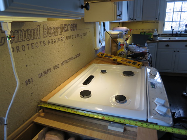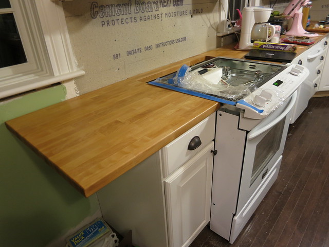 We had to take off the stove-top in order to sand and finish the counter. We used the same sealer as the rest of the counters: Waterlox Original Sealer.