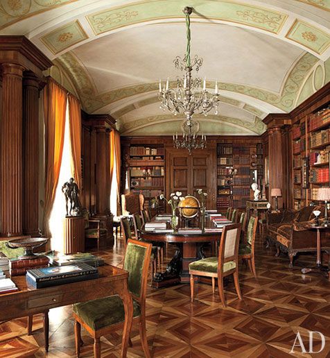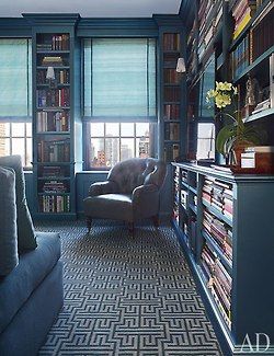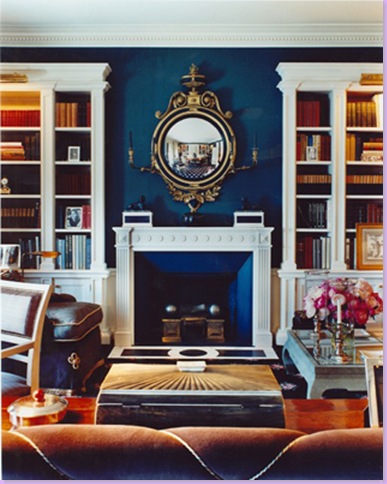 This room by Vincente Wolf in Architectural Digest has the blue built-ins that meld seamlessly with the blue walls. B-E-A-U-Tiful but we do like our wood tones.