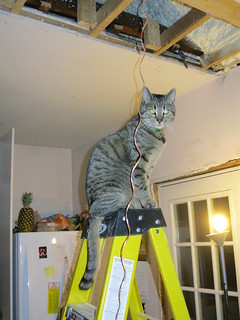 It was a whole-family operation. I was on a step stool pulling, Stefan was on the 8 ft ladder feeding the wires and Vector was on the 6 ft ladder supervising.