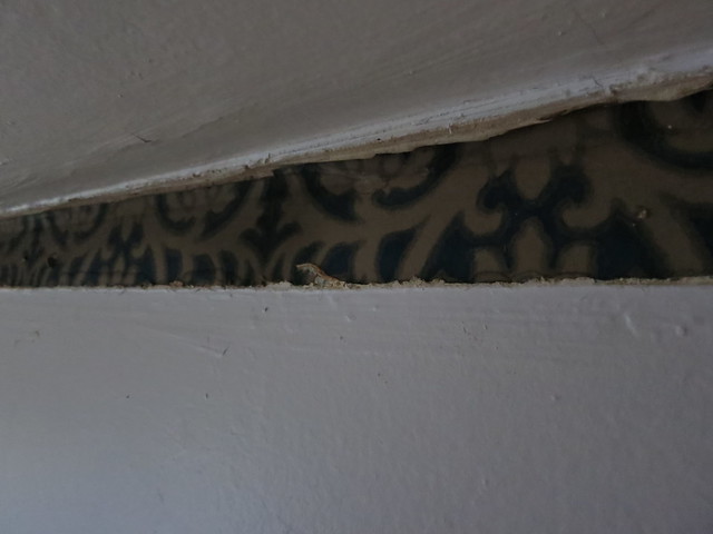 I pulled them down in the Piano room first and I notices some odd brown paper under the moldings. It wasn’t until I moved on to the entry that I realized it was the original wallpaper. The paper in the Piano room must have been a different type because it looked like kraft paper and I couldn’t descern any original pattern. In the entry however…