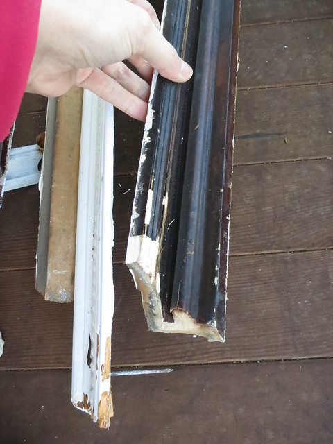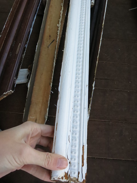 In the first floor entry, dining room, and piano room, we are having the ceilings re-done. We have a plaster guy that is going to put up 3/8″ blue board and plaster over it to tighten up and clean up the ceiling. Before we can get that crew in, the crown moldings needed to come down. The crown in the entry and piano room was a picture rail molding that wasn’t installed or stained particularly well. We’re planning on upgrading the moldings to something a little more substantial.  Here are the picture rail moldings stacked up on the porch.