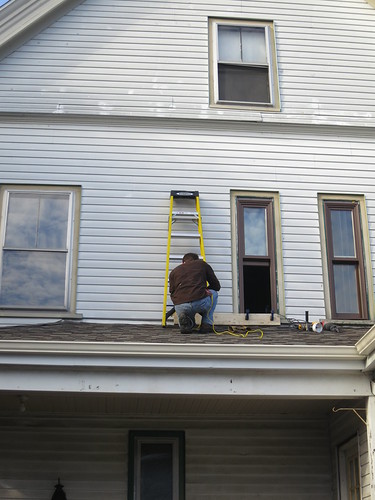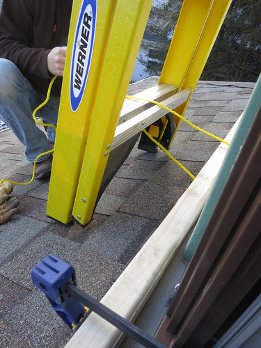 To get there, we just used a 6 foot step-ladder. We tied it to a piece of scrap wood that we clamped through the Green Windows just to keep it from sliding out from under Stefan while he drilled the holes.
