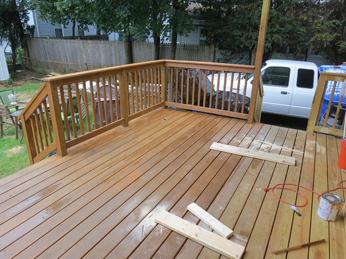 My in-laws came in last weekend for some house work. It’s always great when they visit, so much gets done. I’ve talked about how much energy these two have in earlier posts. This weekend was no exception. I wasn’t nearly as organized as I sometimes am. Things have been stressful at work and I’ve been going and going for so many weekends in a row here that I’m a bit overwhelmed. They enjoyed the free reign though, getting to work on whatever they want. We did have one task for them, the deck needed to be stained and we also wanted to add some balustrading work.