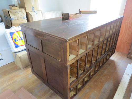 The biggest task of the weekend was moving this beautiful piece of furniture up to the 2nd floor. We bought it just before leaving last weekend. It has been in the back of the truck all wrapped in tarps for a week. The drawers were already out and the base comes in 2 pieces. The smaller of the two weighs maybe 100 lbs. Heavy, but manageable. The larger piece weights…250? 300 lbs? WITHOUT drawers. This is a seriously massive piece of furniture. It took all 4 of us and lots of thinking to get it up the stairs. It is 3’x5′ with drawers on both of the long sides. It is right at 3′ tall but I’m planning on adding little feet and wheels which will make it just a bit taller. The top is scratched and worn any you can see years of struggling to move the piece in all the scuffs and scratches on the sides. The drawers though, are in great condition. All dovetailed joints with brass drawer pulls and label holders. There are 140 drawers. I love love love this piece of furniture. I’m so excited to see it in the library/den all finished and decorated.