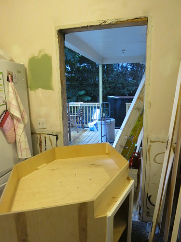 Saturday morning we were off to a great start. We hung 2 more upper cabinets and hey, we’re getting better at this. Sure the walls are all wonky so every corner and every edge has to be shimmed but whatever, we’ve got a system. Then we are ready to start on the lower cabinets. We started in the corner because that’s the highest point in the room. Sounds easy, right? Get corner cabinet, stick in corner. WRONG! the smallest dimension of the corner cabinet is 33 inches. Well, all the doors into the kitchen are 29 inches… Huh. We looked into taking the cabinet apart. Not easy it didn’t look like. We decided the best option was to wheel the cabinet out the front door, around the house, up the deck and through the kitchen door. Oh, and we had to remove the kitchen door. Not just a couple screws on the hinges but completely frame and everything out.
